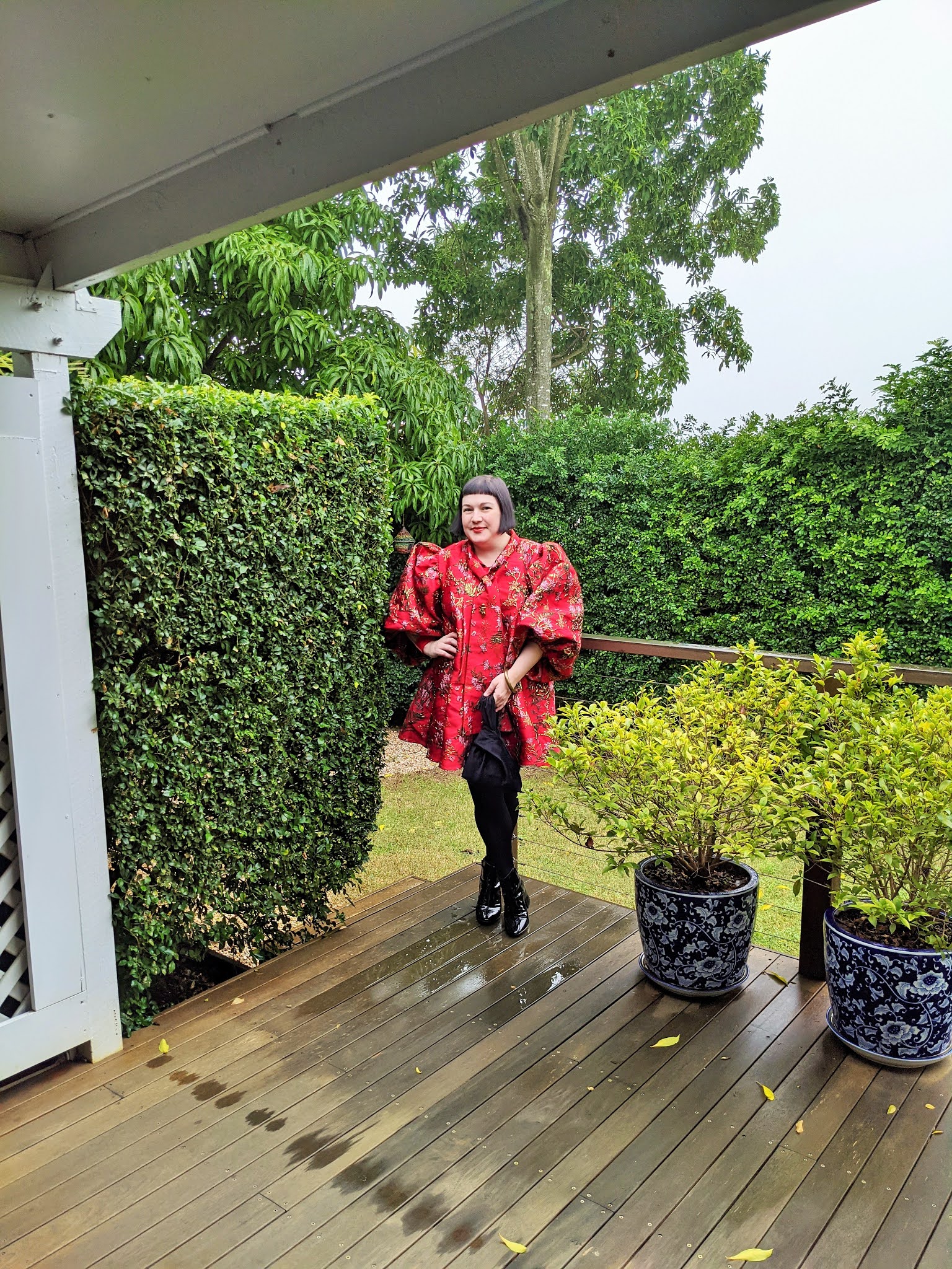 Another day, another fabulous dress for an event in the River City renaissance. I'm swanning around my backyard, dodging the pitter-patter of rain, wearing a statement-making, vibrant red floral textured brocade mini smock dress with extreme puff sleeves & scarf tie neckline from whimsical British label Sister Jane, a pair of shiny black patent leather ankle boots from Aussie shoe design stalwart Wittner, a pair of black 40 denier nylon tights from Razzamatazz to keep my legs feeling toasty-warm & a sumptuous black velvet knot bag from a darling little Spanish boutique on Etsy called Swinging Chicks Shop. Honestly, it's probably the best cost per wear that I've ever gotten from ANY item in my closet - it goes with everything, it fits so much in & it's light as a feather. When it came to jewellery, I really went for it to match the over-the-top nature of the dress, donning a small, vintage brass brooch in the shape of Cupid that some dear friends gave me for my birthday, a brushed brass bangle (phew... what a tongue twister!) from my local Tree of Life store & a handmade red resin cuff with matching chunky cocktail ring (also a thoughtful birthday gift) that really added that perfect finishing touch to the look.