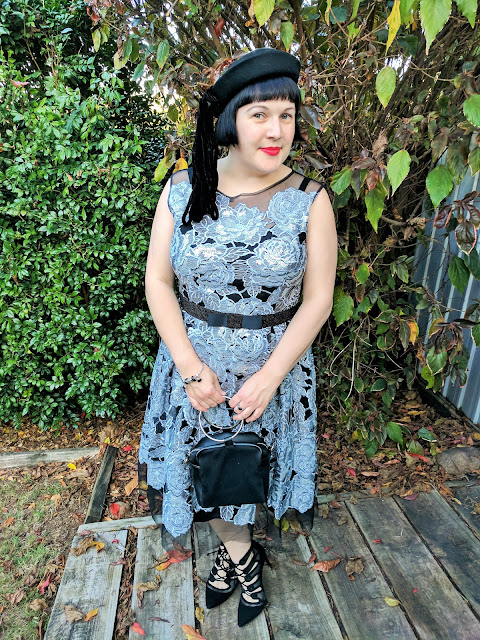 Following on from my last post - a trip down memory lane to a gala in 2017 - are more pictures from that time; these delightful snapshots chronicling the outfit that I wore to attend the gala after party on the same night! I'm swanning about in a stunning black mesh & silver floral sequinned fit-to-flare midi dress with black satin lining from Anthea Crawford, cinched in with a black grosgrain ribbon & beaded belt from retro-inspired Australian label Review, a pair of black suede & patent leather pointy-toed lace-up stiletto heels from Wittner (wonderful to look at but an absolute nightmare to walk in, if I'm being honest), a boxy black suede & vinyl handbag with oversized silver handles from French Connection to carry all the essentials, a matching silver & onyx charm bangle & ring from Pandora & finally, a vintage wool hat with suede "tail" that was gifted to me by some dear friends for this very occasion & really was the icing on the cake!