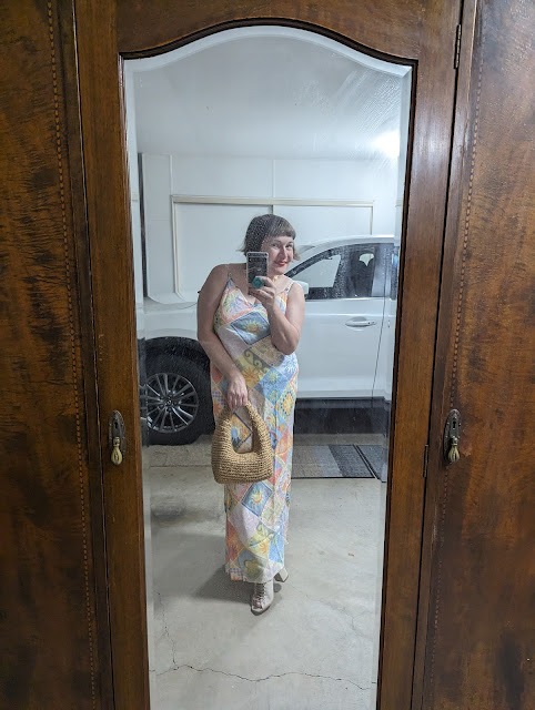 This old girl (16 years old if you can believe it!) has plenty of opinions about the hot & humid weather we've been experiencing... Meanwhile, I'm taking a few little snaps in the mirror before heading out to run some errands in a summer print linen bias-cut slip dress from Ghanda, tan leather & elastic sandals from Wittner & a funky natural woven paper bag with tan leather strap & blue circle detail from Esteems Boutique at Coolangatta.