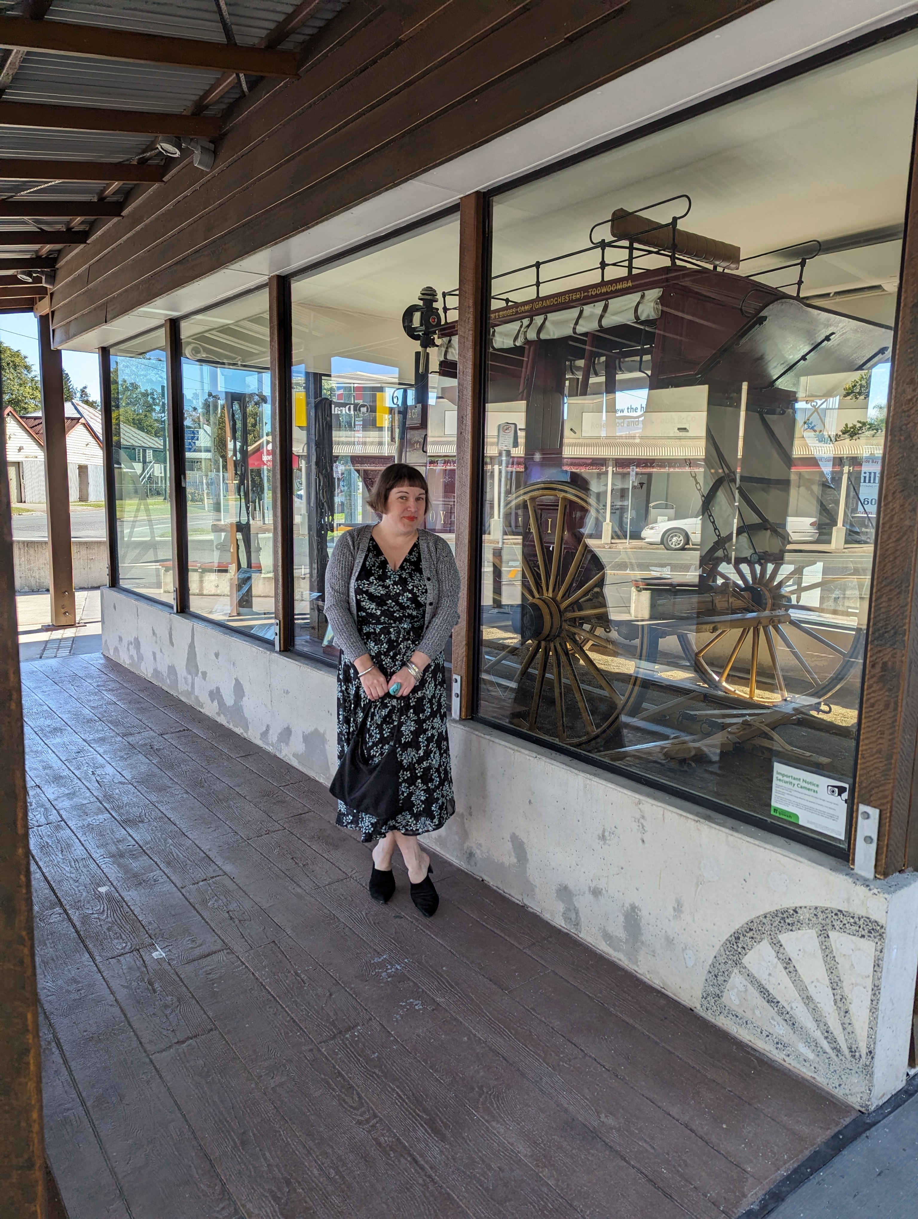 All the pictures from a morning spent enjoying the sunshine in one of my all-time favourite places to visit, the tiny township of Rosewood. It's really got everything I love in one beautiful package - gorgeous, bushland-but-close-to-the-city surroundings, horses & cattle in the paddocks, historical parks, a couple of funky boutiques, some op-shops, cafes & a bakery that serves some delicious sweet treats at old-fashioned prices. For the occasion, I wore a gorgeous black & blue floral silk, three-quarter-sleeved wrap dress with black jersey slip from Australian designer Sacha Drake paired with a grey & black speckled woven acrylic cardigan from the Danni Minogue Petites collection at my local Target store, a pair of black suede pointy-toed mules from Wittner that are so comfortable they are beginning to surpass sneakers as my go-to off-duty shoe choice & my trusty black vinyl 90s-style shoulder bag from Sussan to carry all the essentials. When it came to jewellery, I chose some of my most beloved pieces to "amp up" the everyday - a stack of vintage Mexican silver bangles that some dear friends sent, a single vintage silver bangle from 20th Century Antiques & Collectibles that my younger brother gave me as a birthday present a few years ago & an oversized turquoise & silver cocktail ring from Thousand Island Dressing at Paddington (that I'm pretty sure I've had for at least fifteen years) to add a bohemian finishing touch to the look.