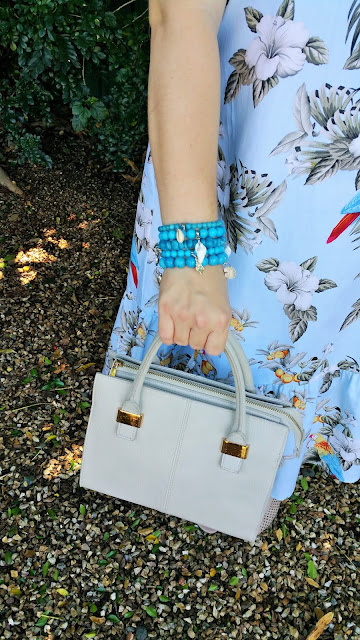 Rather than wear black accessories with such a light coloured ensemble, I donned a pair of bone leather, lace-up sandals from Novo with matching bone vinyl handbag from Sportsgirl to capitalise on the dress' beachy vibe. Furthermore, a stack of beaded bracelets with silver & shell charms from Eb & Ive picked up on the vibrancy of the parrot's wings.
