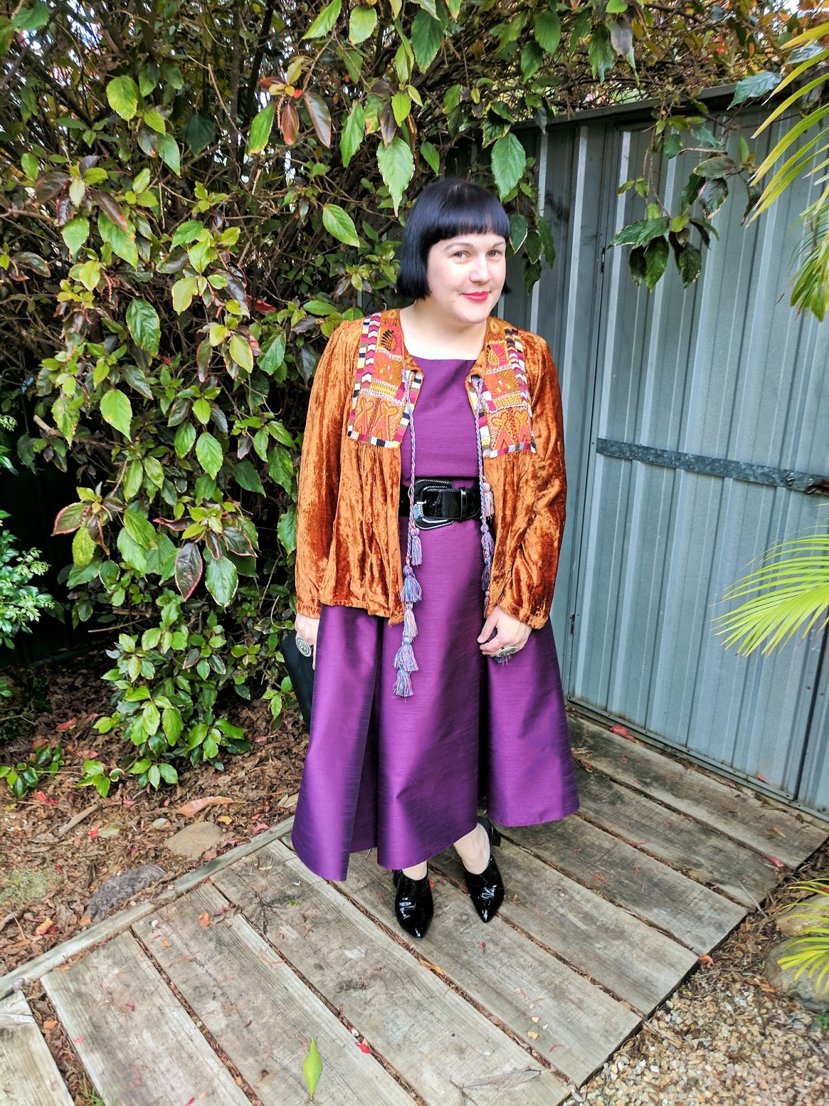 The dip in temperature has me thinking of cooler climates & I just couldn't wait to share with you the gorgeous ensemble I styled up to attend a recent performance of the Russian Ballet with a dear friend of mine. Avid readers of this blog will already know that I'm not one to be scared of block colours on opposite ends of the colour wheel & the two main pieces of this outfit were no exception: this absolutely divine purple shot silk fit-to-flare dress from Anthea Crawford (possibly my all-time favourite silhouette they have EVER made) & sumptuous mustard velvet swing jacket with embroidery details & woven tassels from my local Tree of Life store that I am so SO glad I finally decided to purchase after almost missing out! The colours shouldn't work together but as with many things in this life, opposites attract & they complement each other nicely.