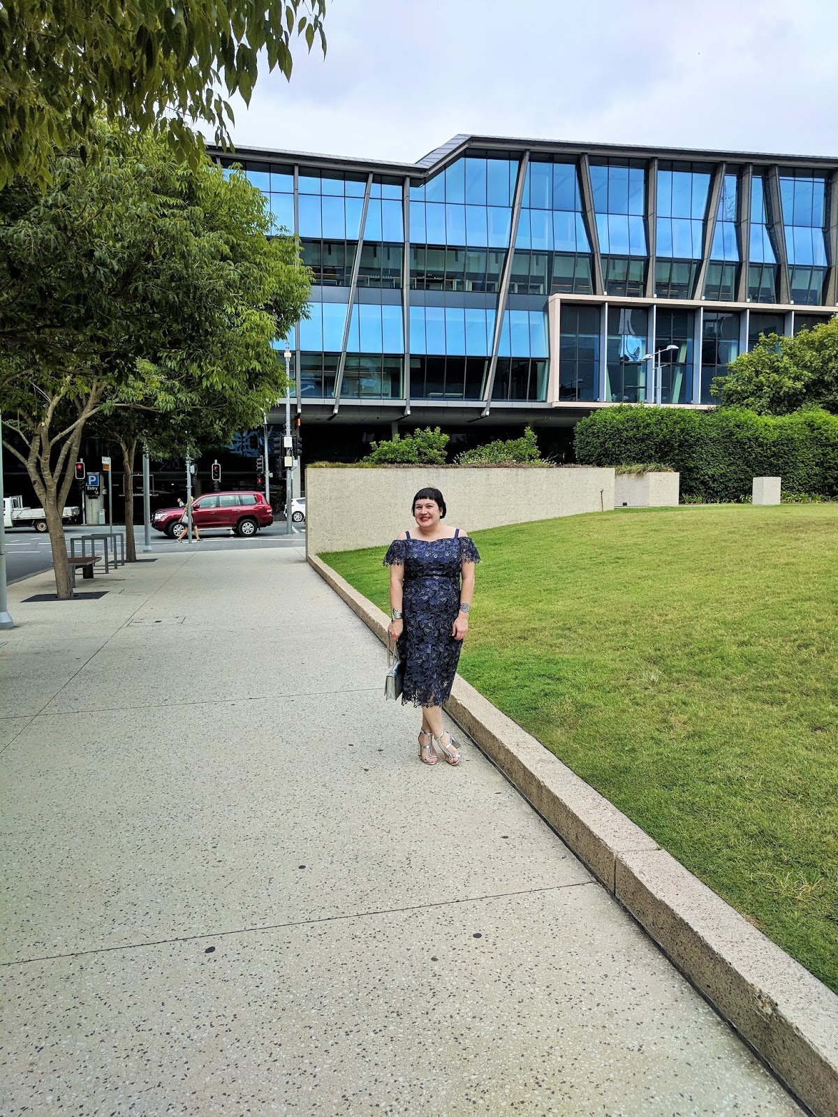 For the first performance, I dressed up in a stunning navy blue & silver floral guipure lace shift dress with cold shoulder detailing, delicate satin straps & a below-the-knee hemline from Anthea Crawford, metallic silver leather t-bar heels from Wittner to elongate my frame & a matching textured silver vinyl shoulder bag with chain strap from Nine West to carry all the essentials. When it came to jewellery, I stayed with the "silver" theme & wore a funky silver tribal cuff from Najo & chunky hinged bangle in the shape of a wave from Precious Stones Jewellers, adding a little bohemian touch to an otherwise classic ensemble.