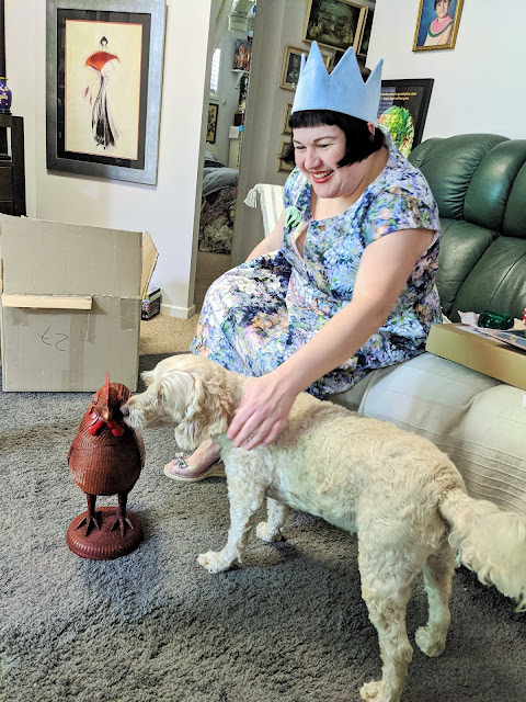 As usual, I had a special "birthday outfit" all styled up & waiting in the wings - an absolutely stunning mauve floral cotton sateen dress with v-neckline, paneled waist & flared hemline from beloved Aussie designer Anthea Crawford (actually called "springtime," which is how I felt when wearing it, as though my spirits were lifted), a pair of funky clear plastic, silver leather & natural rope espadrille wedges from Viguera Spain that I found in a little pop-up store at Indooroopilly Shoppingtown while browsing with a friend earlier in the year & finally, a green & grey glittered resin brooch in the shape of an Ibex from Erstwilder's recent art deco collection - gifted by a dear friend - which was indeed the perfect whimsical finishing touch.