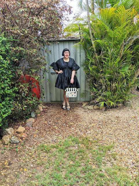 While I'm usually known for wearing vibrant colours & funky prints, sometimes it's good to take things "back to basics" & bust out a Little Black Dress (or LBD for the uninitiated)... albeit with a bit of a twist, as those who read my blog regularly will have come to expect... As soon as I saw the divine puffiness that was the Gothic Desire Tier Dress from Aussie designer label Romance Was Born I was in love, particularly when I realised that it was made from the most amazing taffeta fabric that retains its shape, in a silhouette that just seems to "float" around the body. I've styled it up for a recent styling job in the River City with a pair of black vegan leather heels with white bib detailing from vintage-inspired brand Kitten D'Amour, a kitschy embellished vegan leather "The Biscuit Shop" handbag with brass hardware from Vendula London via the darling Mott & Mulberry store at Indooroopilly Shopping Centre, a thick brass bangle that I picked up years ago at The Way We Wore vintage fair & a thin brass bangle that I discovered at my local Tree of Life store to complete the outfit.