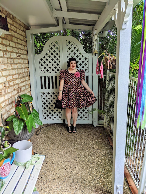 Feeling like I've just stepped out of a time machine in this gorgeous little polka dotted lurex mini dress with black organza back bow from whimsical British label Sister Jane; ideal for an event in the city celebrating all things "Swinging Sixties" fashion including esteemed "youthquake" designer Mary Quant. Truth be told, I'm still a little bit disappointed that the Quant exhibit won't be coming to Brisbane despite visiting Melbourne, but I suppose this was the next best thing... I've styled it up with a pair of black leather lace-up heels from Jo Mercer for added height, a boxy black vinyl handbag with chrome hardware from French Connection to carry all the essentials (hand sanitizer, mask etc), a chunky silver hinged bangle from Wallace Bishop & a pink silk rose corsage from Kitten D'Amour for that sweet finishing touch.