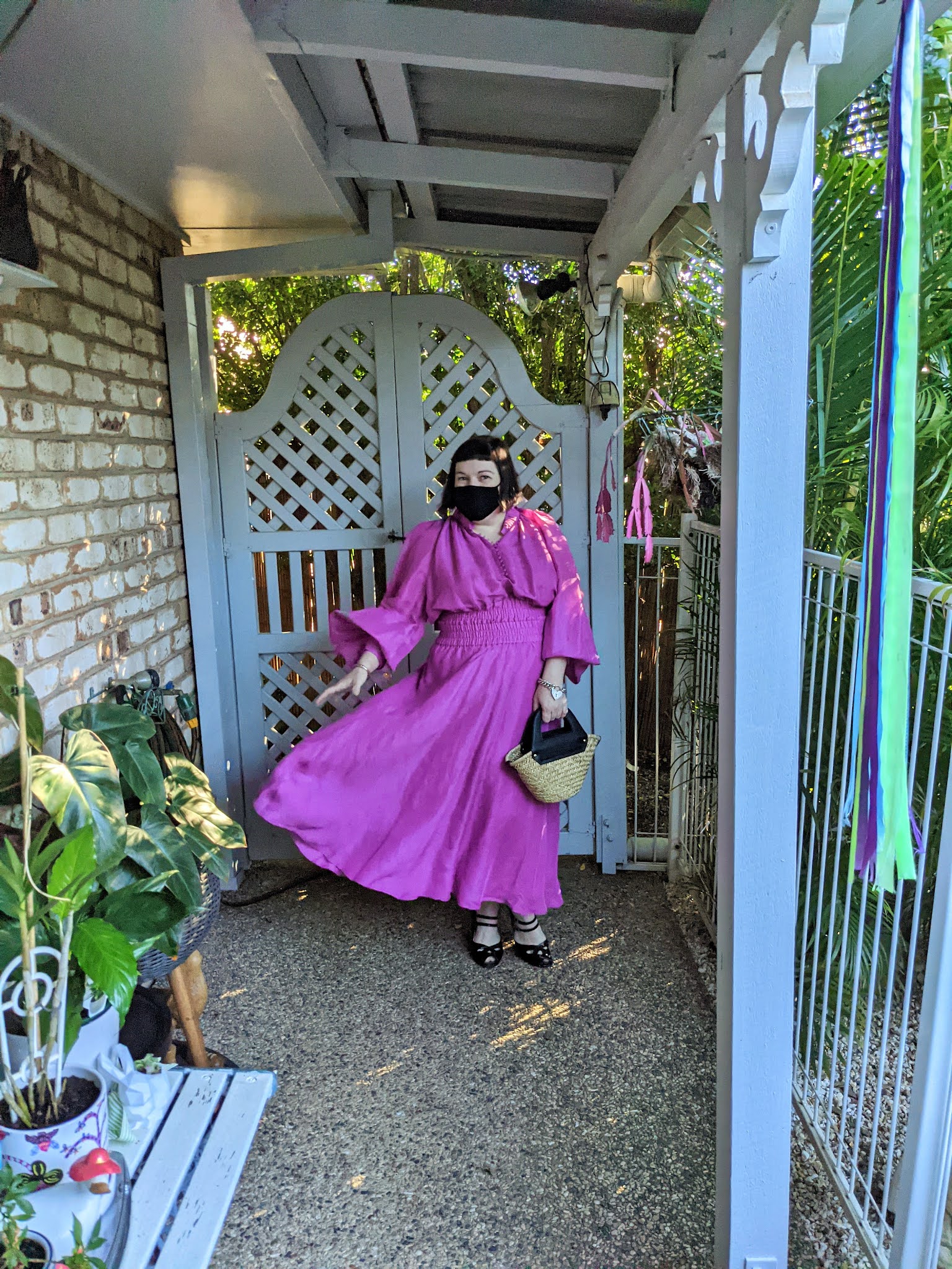 Feeling lovely in this gorgeous, soft linen/silk mix 1930s-style midi dress with modified bishop sleeves, button-down bodice, ruched waistline & floaty, bias-cut skirt in a rich berry shade from celebrated Australian label Country Road. Truth be told, I would seriously love to purchase absolutely everything from their recent collections, which seem to have a strong deco vibe mixed with a relaxed Aussie sensibility... but I digress... I've styled it up for an event in the River City wearing a pair of vintage-inspired black vegan leather dual buckle heels from Kitten D'Amour, a black leather & natural woven straw handbag from Witchery to carry all the essentials, a thin silver hinged bangle from Oxfam, an antique Victorian silver bracelet with oversized heart locket & teeny tiny key from Kellie's Antiques that a dear friend gave me for my 30th birthday & finally, a black woven hemp facemask from Oroton to do my part to help stop the spread of Covid 19.