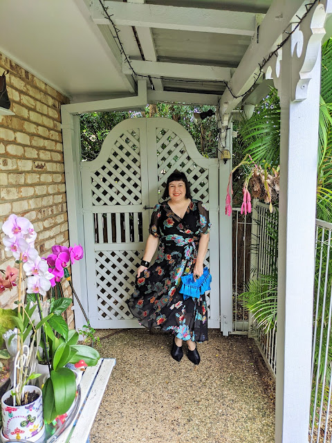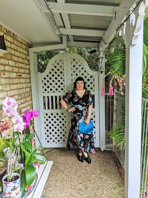 I'm absolutely LOVING Sacha Drake's wrap dresses this season for their versatility, ability to dressed up or down for a myriad of events & innately flattering silhouette regardless of size or height. This stunning little number is made from floral burnout silk with a black elastane slip underneath for modesty & is an utter joy to wear! I've styled it up for a festive event in the River City with a pair of black matte leather ankle boots from Wittner (shaped enough in the front to be mistaken for a normal, heeled shoe but with the sturdiness of a boot, which has really come in handy during these recent downpours), a vibrant blue floral woven envelope-shaped clutch with tassels from the delightful Arte Color Handmade boutique on Etsy & chunky black resin hinged bangle with gold & matching gold teardrop ring with onyx from Aussie designer Samantha Wills to complete the look.