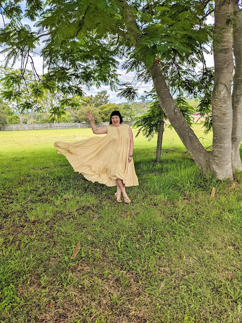 Reveling in the greenery all around me as we head into the (traditionally) cooler months of the year... although that's not really saying a great deal in Queensland, where summertime pretty much lasts all year 'round... I'm wearing the utterly divine Ishya Gown in Butter from Tweed Heads based, slow fashion label Daughters of India, slightly altered/shortened for my five foot frame & styled up with a pair of soft gold vegan leather deco heels from Kitten D'Amour & a stack of vintage silver bangles that some dear friends sent me as a "care package" during the pandemic.