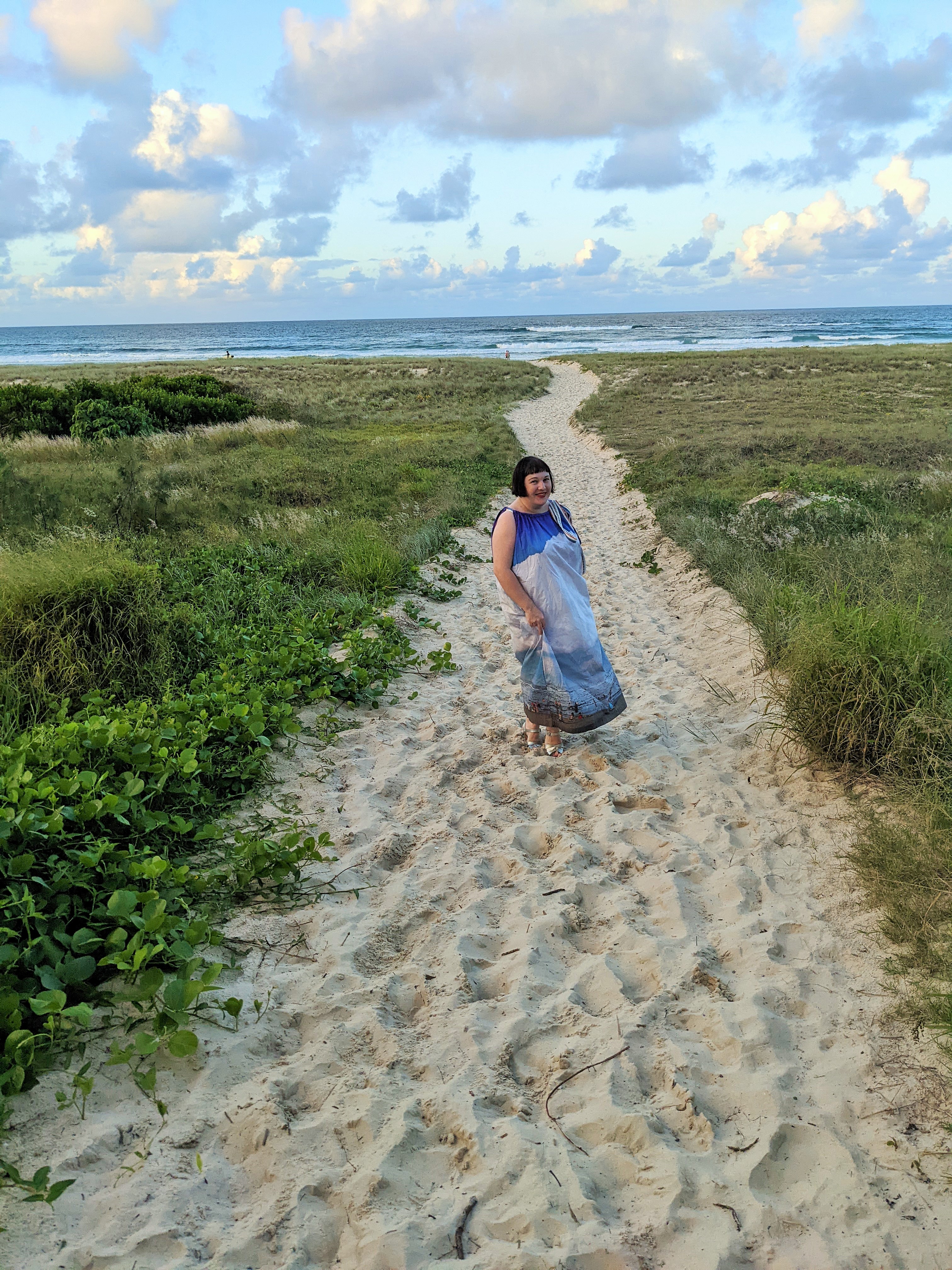 Taking the path less travelled to the beach as the sun begins to set wearing avante garde Australian designer Romance Was Born's amazing Gold Coast photo-print cotton drawstring maxi dress with embroidered ribbon tie (added by me later to replace the heavy silver chain strap that kept swinging around & accidentally whacking me in the face... whoops, the price of fashion...) & a pair of my trusty silver leather Saltwater Sandals for a bit of a metallic moment. Scroll down to see more...