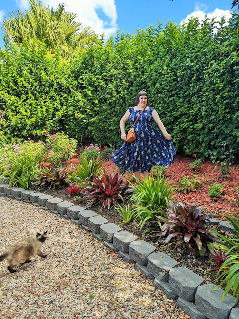 A few little snaps to make you feel happy... Frolicking in the garden with a certain furry interloper on a sunny day (oddly rare in South East Queensland these days) wearing the stunning Night Shadow floral cotton tiered midi dress with shirred bodice from vintage-inspired label Kitten D'Amour, a pair of tan leather & elastic sandals from Wittner for the ideal fusion of comfort & style & a tan vinyl & light wood crossbody bag that I discovered at the delightful Soul Nook Collective in the Old Church at Marburg to complete the look.