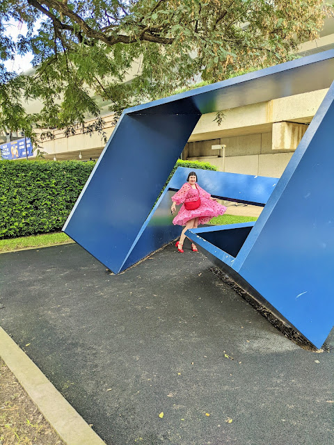 Feeling "at one" with this immersive sculpture in Southbank's Cultural Centre forecourt wearing this stunning piece of wearable art from whimsical British label Lace & Beads (via online emporium Asos) with its bright pink hue, red glitter heart patterned mesh & mini dress with puff sleeves silhouette, lipstick red vegan leather deco heels from Kitten D'Amour for a modicum of height & that sweet retro feel, an upcycled vinyl crossbody bag from Country Road to carry all the essentials & finally - carrying on with the heart theme - a Victorian silver belcher bracelet with large heart locket & teeny tiny key from Kellie's Antiques, gifted to me for my 30th birthday by a very dear friend.