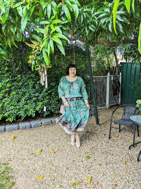 But I digress. For those who are interested, here's more about the ensemble... The stunning green & pink floral print viscose drop-waist midi dress with its voluminous three-quarter-length sleeves, elasticated waistline & tasseled neck from bohemian label Lula Soul (discovered at the divine Hummingbird the Shop in Paddington) was the perfect way to evoke a little bit of Julia Flyte for the occasion, particularly when mixed with a pair of blush pink leather pointy-toed lace-up heels from Wittner, a blush pink vinyl shoulder bag with silver chain strap from Forever New to carry all the essentials (hand sanitizer & facemask at the ready), a vintage silver bangle from the sadly-now-defunct 20th Century Antiques & Collectibles at Coolangatta & a stack of seven Mexican silver bangles that were sent to me by some dear friends who currently live overseas to complete the look.