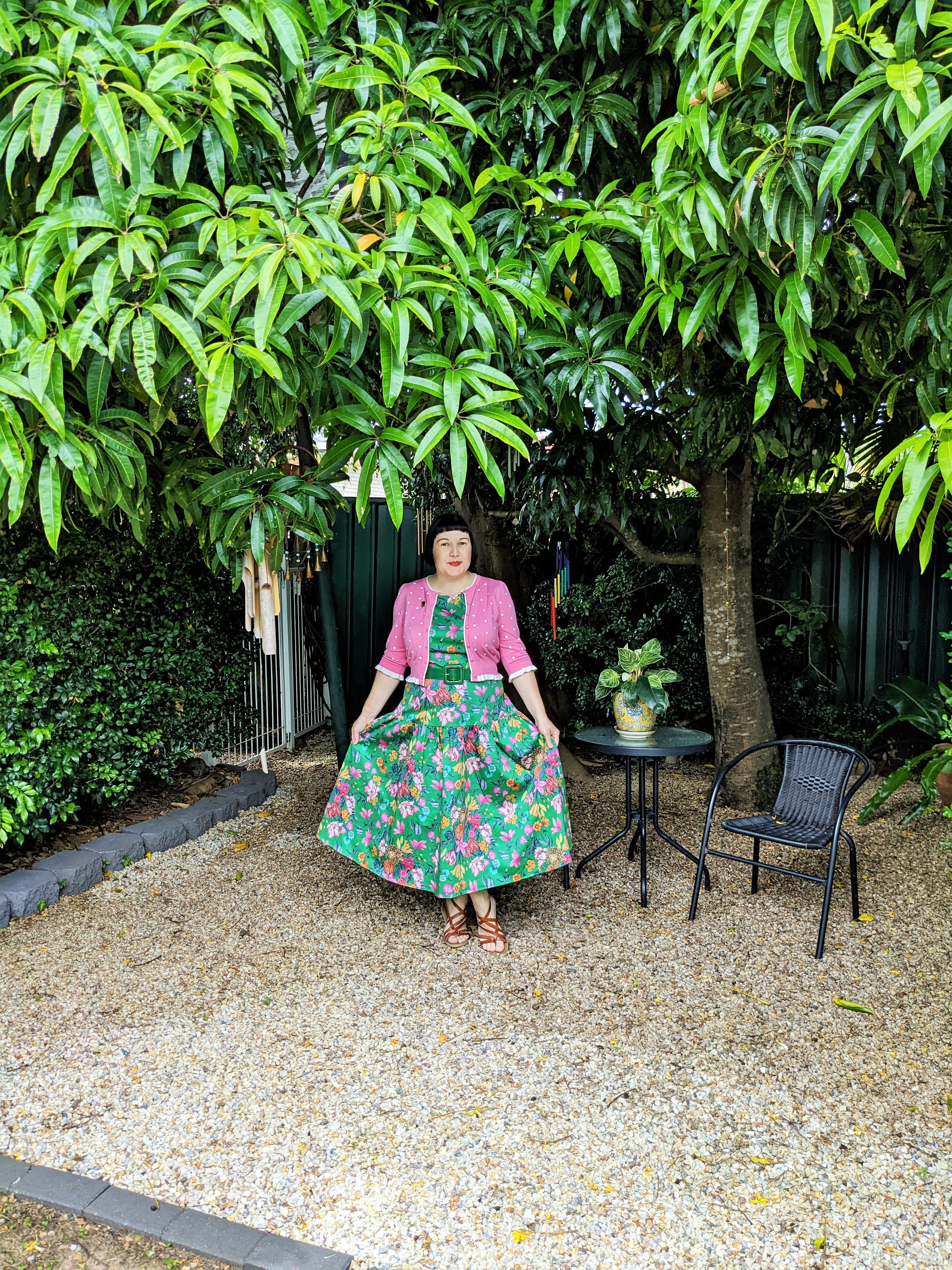 For the occasion, I wore a beautiful & bright floral Liberty print cotton drop-waist midi dress from Review's recent collaboration with the historic London label, cinched in with a wide green patent leather belt, a cropped pink & white spotted knit cardigan with ruffled cuffs & diamante buttons from Kitten D'Amour, a pair of brown vegan leather gladiator sandals with brass buckles from Blowfish Malibu via Williams Shoes & finally, a sweet little handblown glass Christmas tree brooch that some dear friends gave me this time last year.