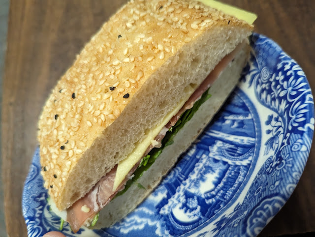 Lunch lately... a Proscuitto Sandwich with Cheese, Rocket, Red Capsicum & Aioli