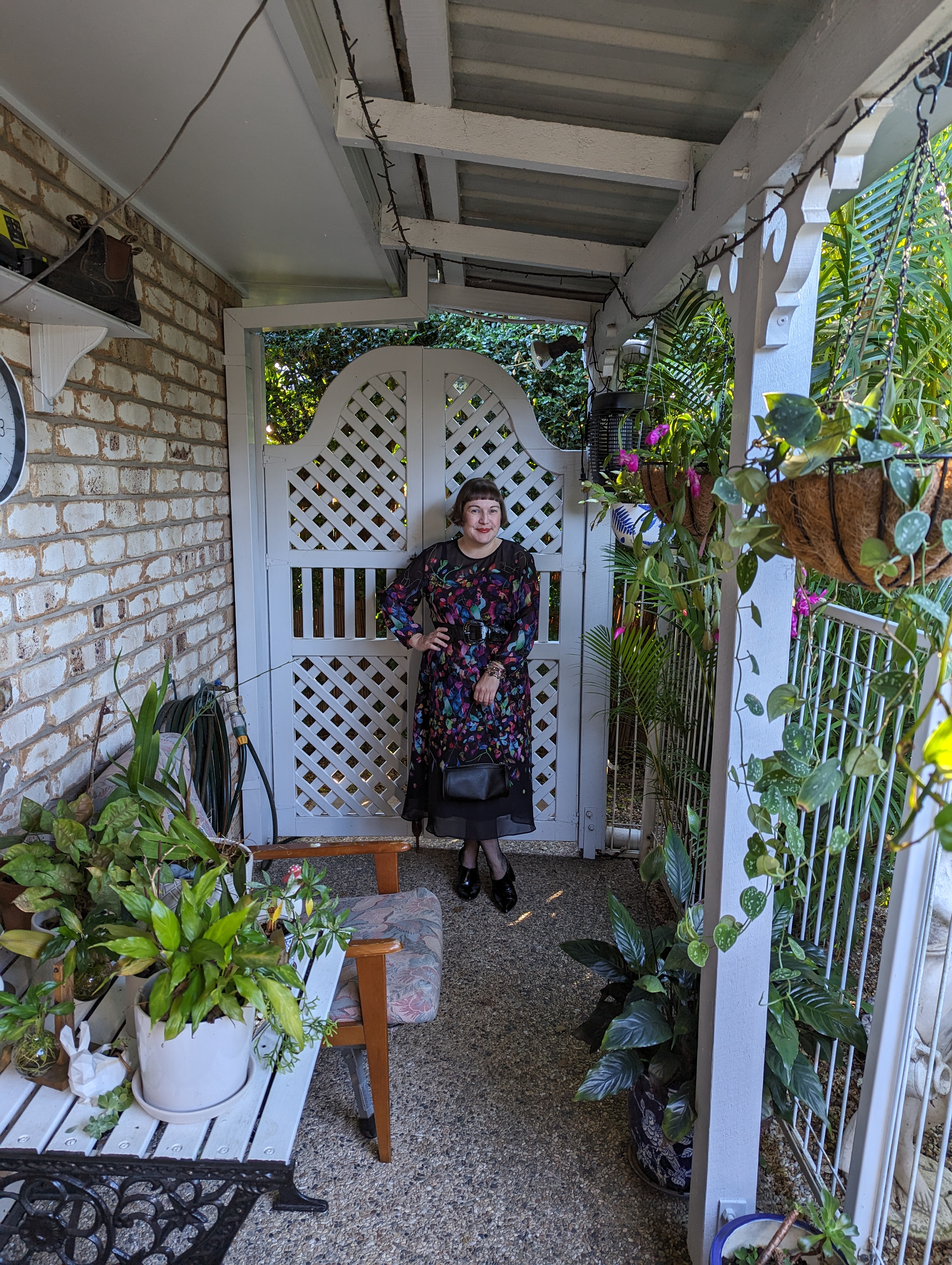 Feeling "bold in the cold" weather wearing this stunning ensemble full of print & texture to a recent special event in my beloved River City! The entire looks is based around this gorgeous almost "opaline" leaf print, midi-length, long-sleeved chiffon dress from Australian designer Anthea Crawford, cinched in at the waist with a wide elastic & vegan leather belt from retro-inspired That Shop & styled up with a pair of shiny black patent heeled booties from Wittner for a modicum of height, black fishnet tights with a little line of satin bows running down the back of each leg from Dangerfield for added texture, a black vinyl cylindrical handbag from Beach n Beyond at Coolangatta to carry all the essentials & finally, a stack of faceted bead bracelets from Jeweled Bazaar Boutique via Etsy to complete the look & pick up on the tones inherent in the dress print for cohesion.